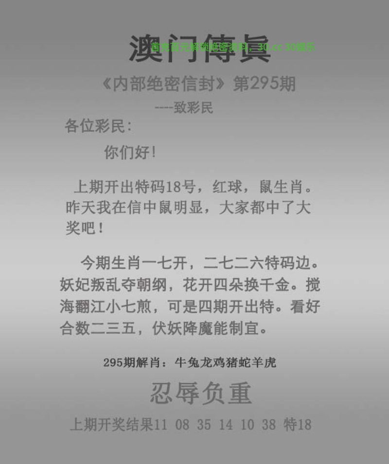 295期:澳门内幕传真 今期生肖一七开,二七二六特码边。 妖妃叛乱夺朝纲,花开四朵换千金。 搅海翻江小七煎,可是四期开出特。 看好合数二三五,伏妖降魔能制宜。 忍辱负重 解:今期生肖一七开,二七二六特码边。一七解17牛,二七解兔,二六解龙。妖妃叛乱夺朝纲,花开四朵换千金。金肖猴鸡,搅海翻江小七煎,可是四期开出特。七解猪,四解虎。看好合数二三五,伏妖降魔能制宜。02.03.05合。 拐特九肖:牛兔龙猴鸡猪虎蛇羊 |